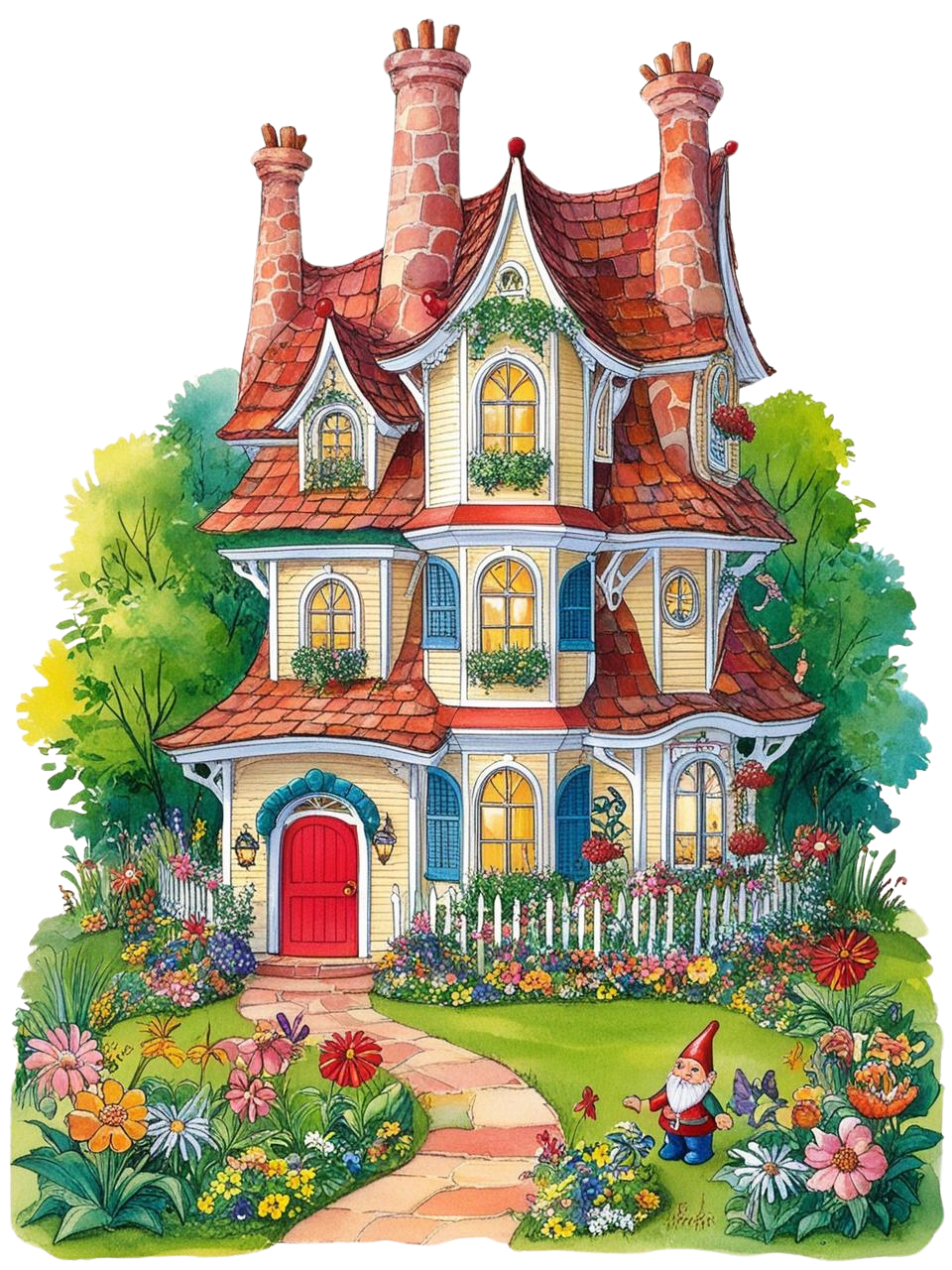 They walked along the path. It was made of red and pink stones. It wound around the garden to the old red wooden door. They pressed the door bell...